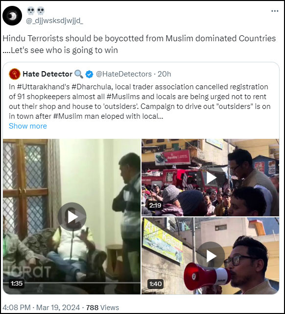 X user djjwsksdjwjjd called Hindus “terrorists” and called for their boycott in Islamic countries.