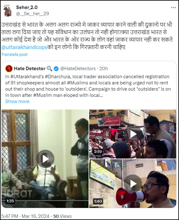 X user Seher presented as if Muslims were asked to leave just because they were “outsiders”. She questioned what would happen if the shops of Uttarakhandis in other states were forced to shut. She also called for arresting the locals for trying to save their women from Islamists.