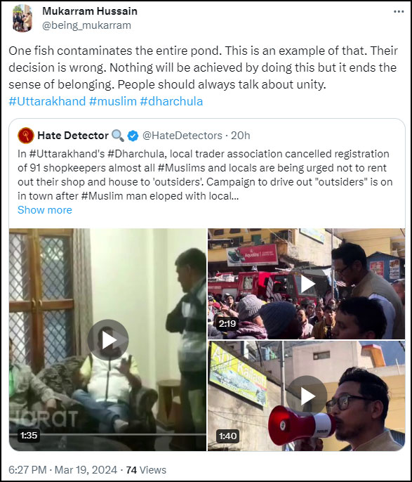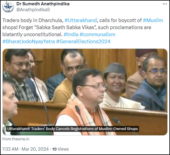 In #Uttarakhand's #Dharchula, local trader association cancelled registration of 91 shopkeepers almost all #Muslims and locals are being urged not to rent out their shop and house to 'outsiders'. Campaign to drive out "outsiders" is on in town after #Muslim man eloped with local… pic.twitter.com/gROVfSuRMQ
