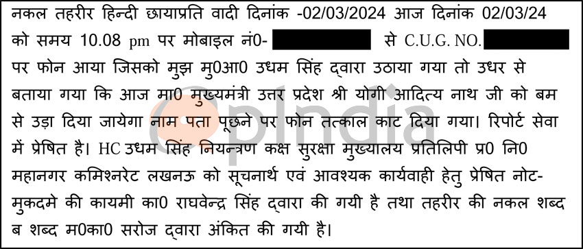 OpIndia accessed the FIR registered in the matter. The FIR suggested that on 2nd March 2024, Udham Singh received a call at 10:08 PM. The caller told him that Uttar Pradesh Chief Minister Yogi Adityanath would be blown up with a bomb. When he asked the caller his name and address, he abruptly disconnected the call.