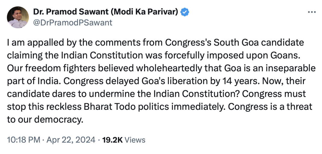 “Our freedom fighters believed wholeheartedly that Goa is an inseparable part of India. Congress delayed Goa’s liberation by 14 years. Now, their candidate dares to undermine the Indian Constitution? Congress must stop this reckless Bharat Todo politics immediately. Congress is a threat to our democracy”, Pramod Swant posted on X.