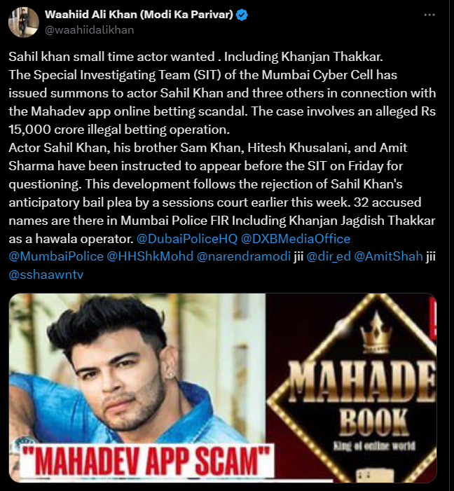 On 15th December 2023, the journalist stated his post with, “Sahil Khan small time actor wanted, including Khanjan Thakkar. He further wrote that Sahil Khan and three other actors had received summonses from the Mumbai Cyber Cell’s Special Investigating Team (SIT) regarding the Mahadev app online betting incident. An alleged unlawful betting enterprise of Rs 15,000 crore is at issue in this case.