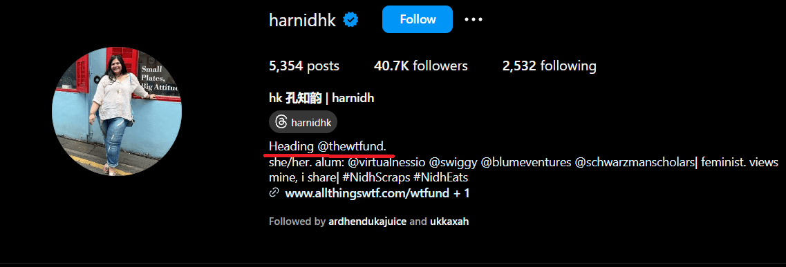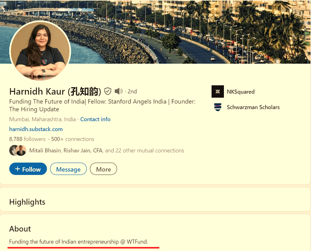 Harnidh Kaur is one of the important team members of the ‘WTFund.’ Her LinkedIn bio says, “Funding the future of Indian entrepreneurship @WTFund”