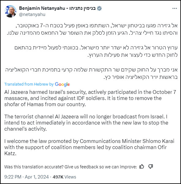 In a post on X in Hebrew, Netanyahu wrote, “Al Jazeera harmed Israel’s security, actively participated in the October 7 massacre, and incited against IDF soldiers. It is time to remove the shofar of Hamas from our country. The terrorist channel Al Jazeera will no longer broadcast from Israel. I intend to act immediately by the new law to stop the channel’s activity. I welcome the law promoted by Communications Minister Shlomo Karai with the support of coalition members led by coalition chairman Ofir Katz.” Al Jazeera is accused of publishing pro-Hamas reports.