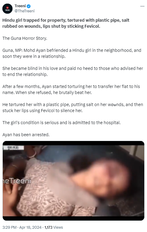A 24-year-old man identified as Ayan Pathan was arrested in Madhya Pradesh’s Guna district on Thursday (18th April) for reportedly assaulting, raping, and torturing a Hindu woman by applying salt and chilli powder on her wounds and also for pouring glue in her mouth.