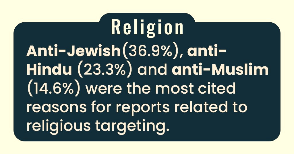 “Anti-Jewish (36.9%), anti Hindu (23.3%) and antiMuslim (14.6%) were the most cited reasons for reports related to religious targeting,” it stated.