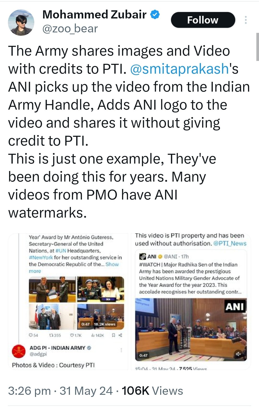 “The Army shares images and Video with credits to PTI. @smitaprakash’s ANI picks up the video from the Indian Army Handle, Adds the ANI logo to the video and shares it without giving credit to PTI. This is just one example, They’ve been doing this for years. Many videos from PMO have ANI watermarks,” Zubair tweeted.