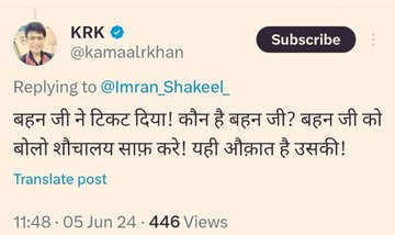 KRK shared news articles and accused her of blaming the Muslim community for her party’s dismal performance in the Lok Sabha election. He stated that the Muslims of Uttar Pradesh are neither her nor her father’s servants and can vote for any party they want. He also added that the politician has not done any favours on them.