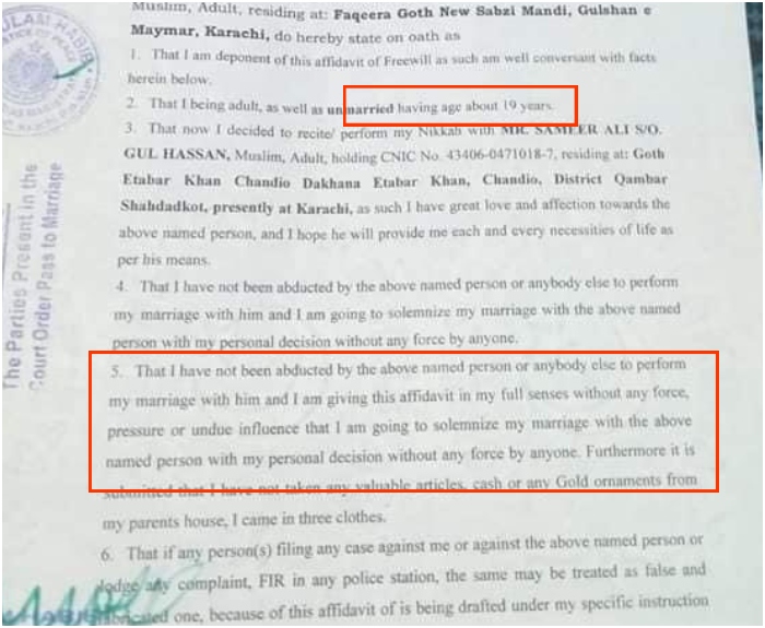 The accused as per Pervaiz, forced the girl to sign an affidavit that read that she was 19, an adult, and that she was marrying Sameer Ali out of love respecting her free will.