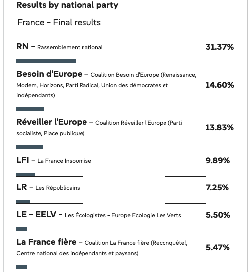 While the Rassemblement National (National Rally) received 31.37% votes, Marcon’s Renaissance Party and its coalition Besoin d’Europe got just 14.60% votes.