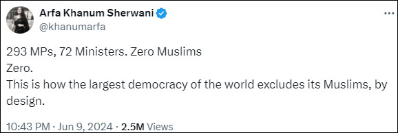 Propagandist posing as a journalist, The Wire’s Arfa Khanum Sherwani said in a post on X, “293 MPs, 72 Ministers. Zero Muslims Zero. This is how the largest democracy of the world excludes its Muslims, by design.”.