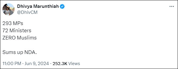She was not the only one to assert that the Bharatiya Janata Party-led NDA government at the centre believes in excluding Muslim representation by design. Several others also accused the Modi government of “deliberate” exclusion. Congress supporter Dhivya Marunthiah posted, “293 MPs 72 Ministers ZERO Muslims Sums up NDA.”
