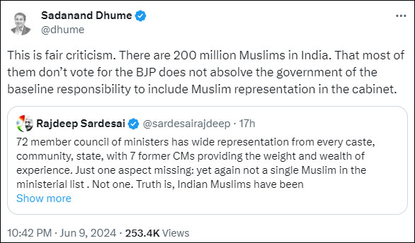 Quoting Sardesai, journalist Sadanand Dhume said, “This is fair criticism. There are 200 million Muslims in India. That most of them don’t vote for the BJP does not absolve the government of the baseline responsibility to include Muslim representation in the cabinet.”