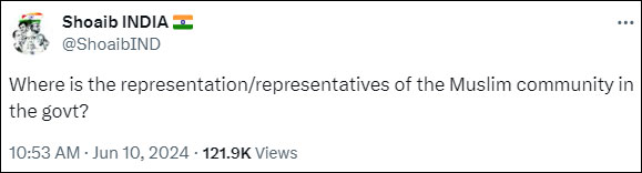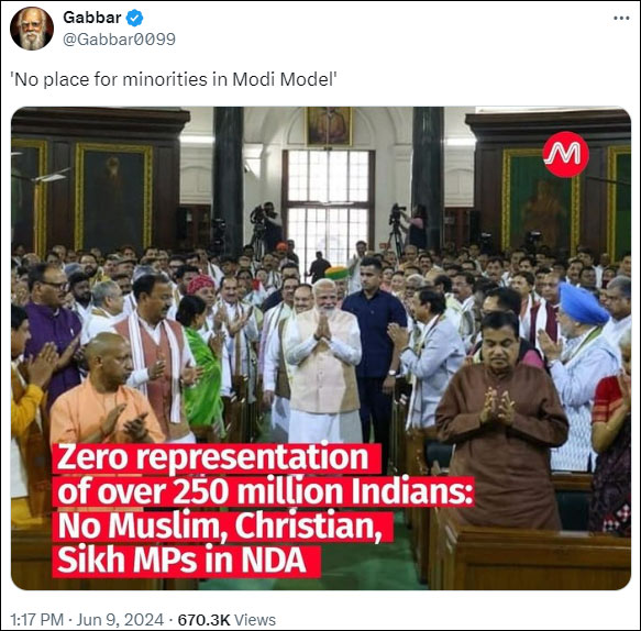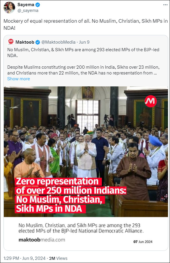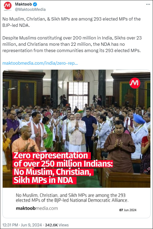 In a post, Makhtoob Media said, “No Muslim, Christian, & Sikh MPs are among 293 elected MPs of the BJP-led NDA. Despite Muslims constituting over 200 million in India, Sikhs over 23 million, and Christians more than 22 million, the NDA has no representation from these communities among its 293 elected MPs.”