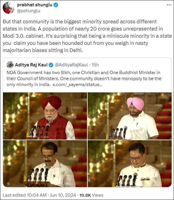 Journalist Prabhat Shunglu said, “But that community is the biggest minority spread across different states in India. A population of nearly 20 crore goes unrepresented in Modi 3.0. cabinet. It’s surprising that being a miniscule minority in a state you claim you have been hounded out from you weigh in nasty majoritarian biases sitting in Delhi.” He was quoting journalist Adiya Raj Kaul who had quoted propagandist posing as RJ, Sayema, raising similar questions and informed her that NDA government has minority representation as there are two Sikhs, one Christian and one Buddhist Minister in the Council of Ministers.