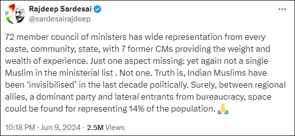 Rajdeep Sardesai, who is a Journalist and husband of Trinamool Congress’s journalist-turned-Rajya Sabha MP Sagarika Ghose, said in a post on X, “72 member council of ministers has wide representation from every caste, community, state, with 7 former CMs providing the weight and wealth of experience. Just one aspect missing: yet again not a single Muslim in the ministerial list . Not one. Truth is, Indian Muslims have been ‘invisibilised’ in the last decade politically. Surely, between regional allies, a dominant party and lateral entrants from bureaucracy, space could be found for representing 14% of the population.”