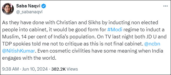 Author and propagandist Saba Naqvi said, “As they have done with Christian and Sikhs by inducting non elected people into cabinet, it would be good form for Modi regime to induct a Muslim, 14 per cent of India’s population. On TV last night both JD U and TDP spokies told me not to critique as this is not final cabinet. Even cosmetic civilities have some meaning when India engages with the world.”