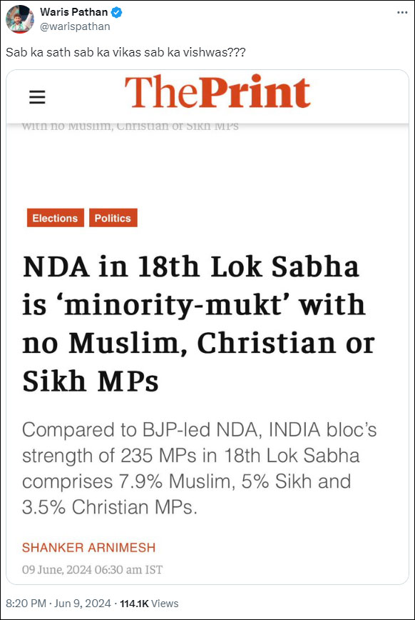 AIMIM national spokesperson sarcastically wrote, “Sab ka sath sab ka vikas sab ka vishwas???” while quoting misleading report by The Print that suggested there were no Muslim, Christian or Sikh MPs in NDA.