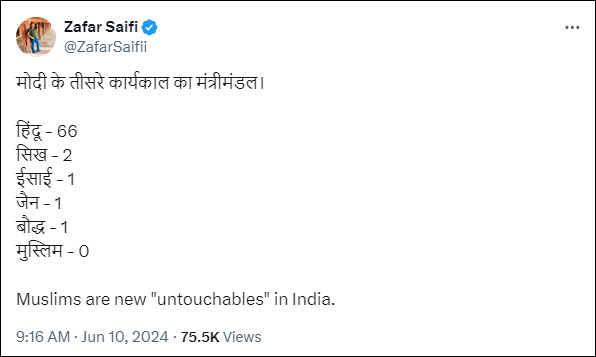 X user Zafar Saifi said, “Muslims are new “untouchables” in India” as there were no Muslims in Modi Govt 3.0.