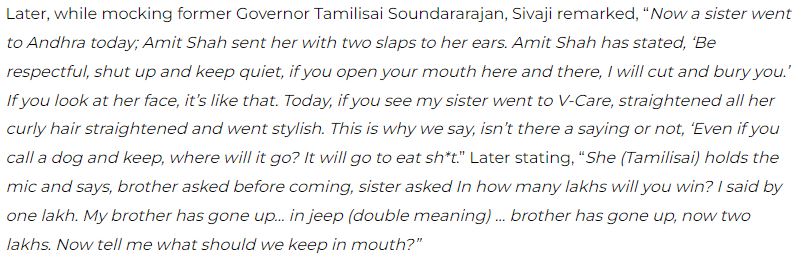 Later, he started mocking former Governor Tamilisai Soundararajan. Sivaji remarked, “Now a sister went to Andhra today; Amit Shah sent her with two slaps to her ears…”