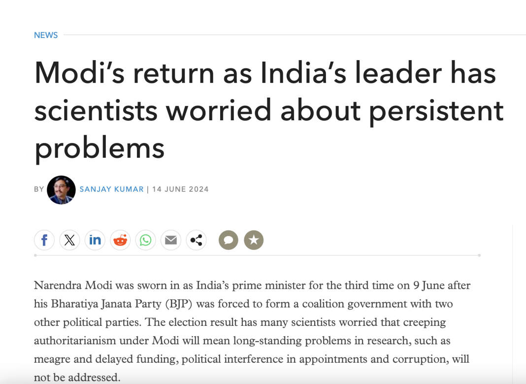 “The election result has many scientists worried that creeping authoritarianism under Modi will mean long-standing problems in research, such as meagre and delayed funding, political interference in appointments and corruption, will not be addressed,” Kumar contends in the article, of course, without providing any evidence or quoting ‘scientists’ claiming there is an environment that discourages scientific scholarship.