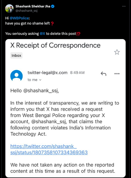Supreme Court lawyer Shashank Shekhar Jha questioned if the West Bengal police has no shame left that they are asking X to delete his post wherein he talked about the incident in question.