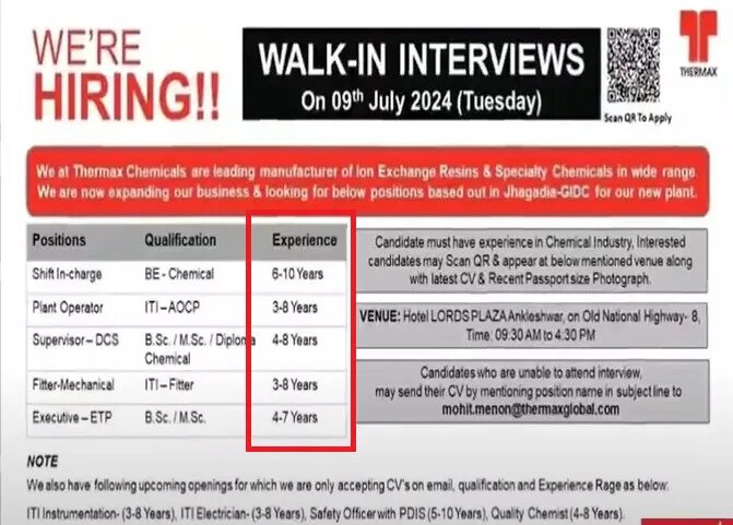 The job was offered by a chemical company and it was mentioned that they were setting up a new plant at Zaghadia GIDC and wanted “experienced” persons. The job posting makes it quite obvious that candidates with three to ten years of experience are to apply. Candidates with 6 to 10 years of experience for the position of a shift in charge, 3 to 8 years as a plant operator, 3 to 8 years as a mechanical fitter, 4 to 7 years as a DSC supervisor and 4 to 7 years for ETP executives are being sought after by the company.