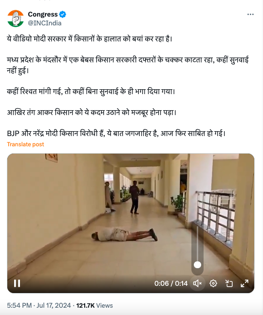 “This video describes the condition of farmers under Modi government. In Mandsaur, Madhya Pradesh, a helpless farmer kept making rounds of government offices, but his plea was not heard anywhere. At some places bribe was demanded and at other places people were sent away without any hearing. Ultimately, fed up, the farmer was forced to take this step. It is a well known fact that BJP and Narendra Modi are anti-farmer, it has been proved again today,” Congress posted.