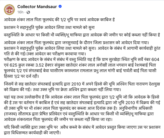In an official statement, the Collector of Mandsaur Dilip Kumar said, “The applicant Shankar Lal, son of Phoolchand, is himself in possession of 1/2 of his land. The administration received the application sympathetically and heard the matter. Based on the facts, no person/land mafia has occupied the applicant’s land. The applicant Shankar Lal, son of Phoolchand, submitted an application to the district administration during the public hearing. The administration received the application sympathetically and heard the matter. Further action regarding the application was taken at a quick pace. The said application was examined.”