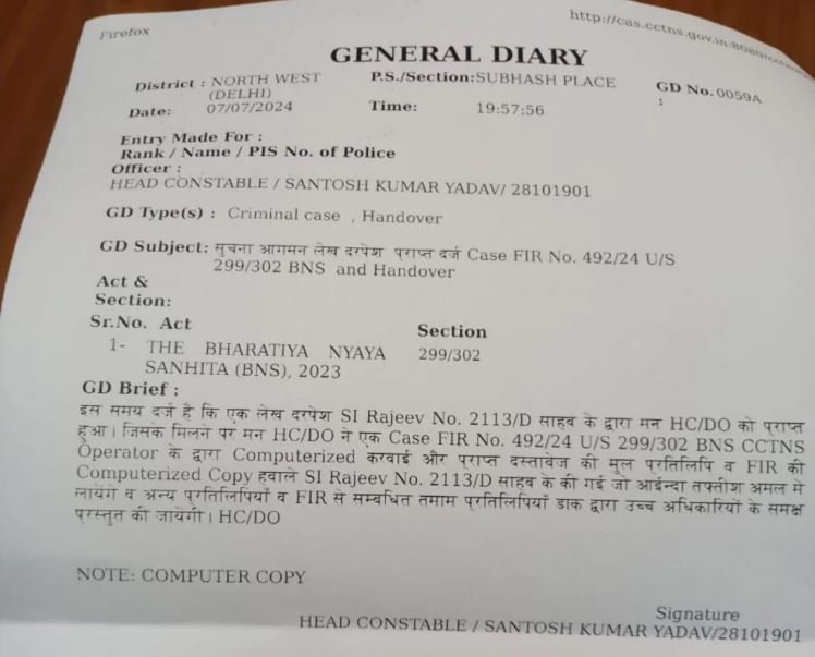 Subsequently, on 7th July, based on the father’s complaint, the Subhash Place police registered an FIR (number: 492/2024) under sections 299 and 302 of the Bharatiya Nyaya Sanhita (BNS).