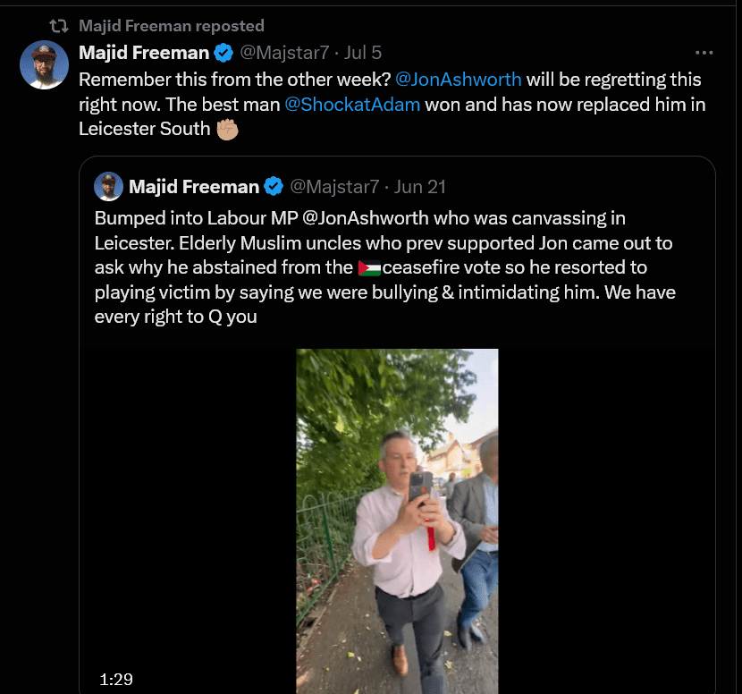 In one tweet, he said, “Remember this from the other week? @JonAshworth will be regretting this right now. The best man @ShockatAdam won and has now replaced him in Leicester South.”