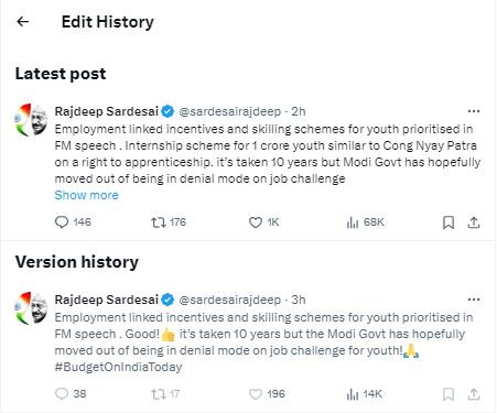 The edited post read, “Employment-linked incentives and skilling schemes for youth prioritised in FM speech. Internship scheme for 1 crore youth similar to Cong Nyay Patra on a right to apprenticeship. it’s taken 10 years but Modi Govt has hopefully moved out of being in denial mode on job challenge for youth! Good (with thumbs up and folded hand emoji)”