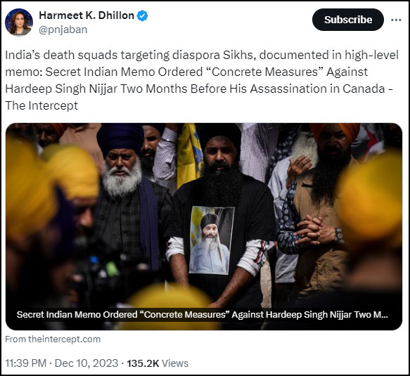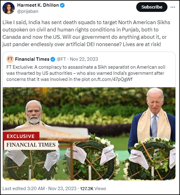 In November 2023, she again targeted the Indian government over baseless claims of “death squads” being sent to kill “North American Sikhs”.