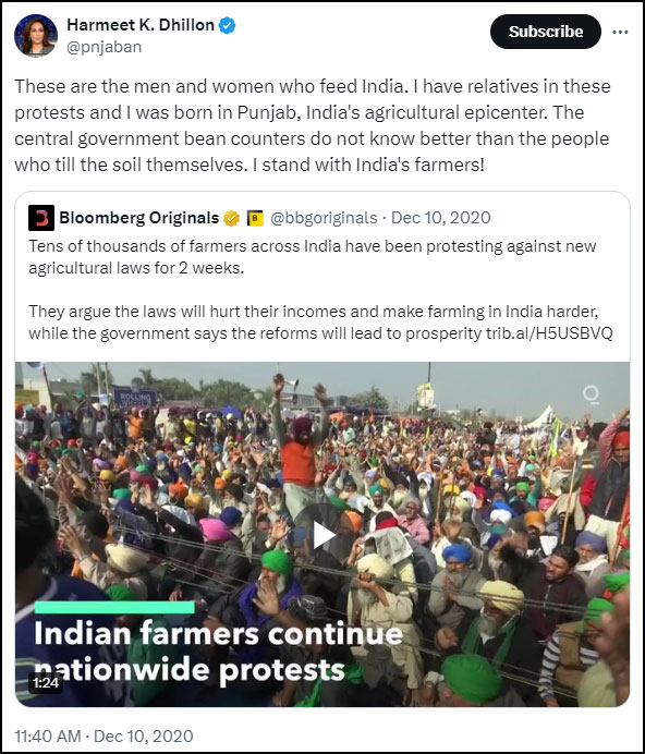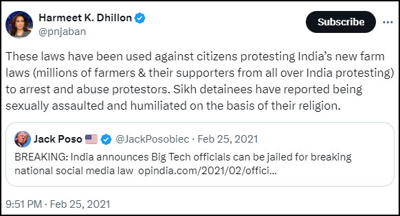 In February 2021, quoting a report on the Indian government’s crackdown on social media platforms for ignoring orders to block fake reports and anti-India posts, Dhillon made shocking and completely baseless allegations that Sikh detainees were sexually assaulted and humiliated based on their religion during farmer protests.