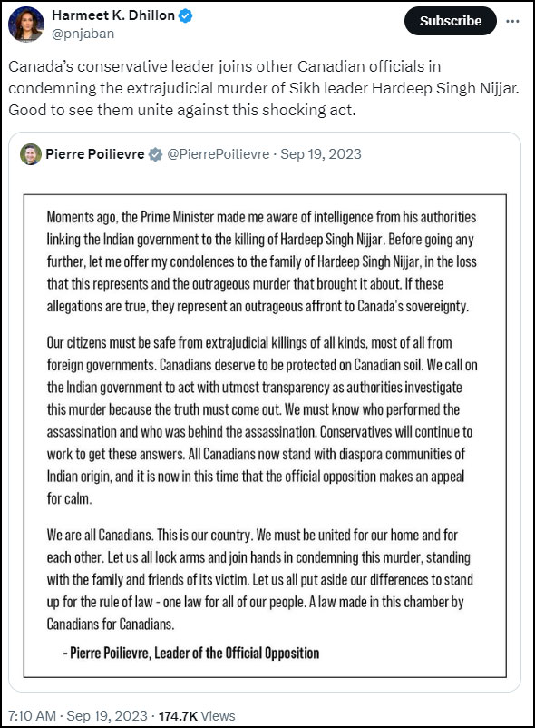 Dhillon wrote, “Canada’s conservative leader joins other Canadian officials in condemning the extrajudicial murder of Sikh leader Hardeep Singh Nijjar. Good to see them unite against this shocking act.” Notably, at that time, Trudeau did not provide any evidence to support his allegations and the Canadian government has yet to provide any substantial evidence against India.