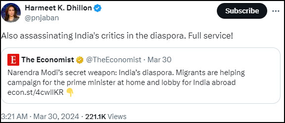 In March this year, just ahead of the Lok Sabha Elections 2024, she quoted The Economist report on how Indian migrants were helping PM Narendra Modi in campaigning at home and lobbying for India abroad. Quoting the report, Dhillon again repeated the baseless accusations against India that the Indian government is assassinating critics in the diaspora.