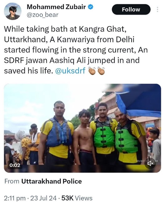 The very next day, on July 24th, the Uttarakhand police again took to X to post a similar news. This time they mentioned how SI Atul Singh, diver Sunny Kumar and Vikrant saved a Kanwariya, a resident of Farrukhabad, from drowning.