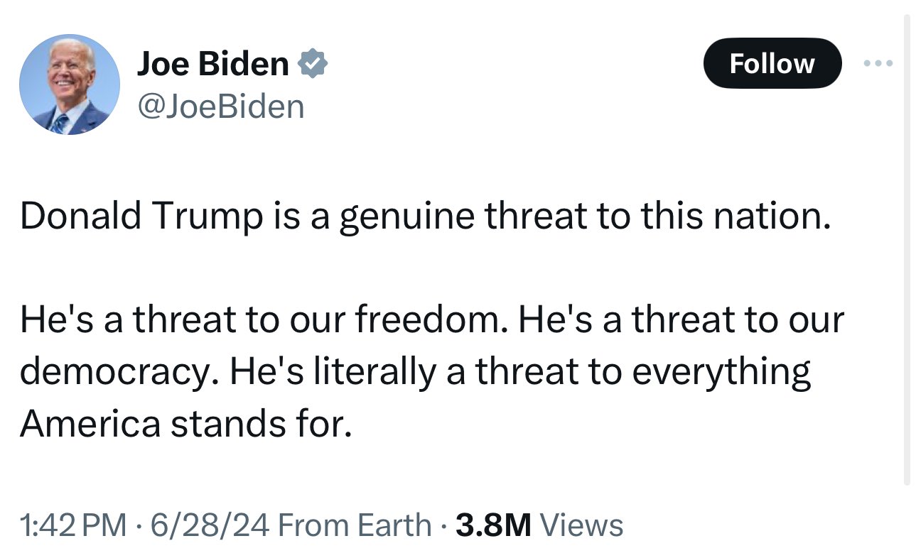 "Most importantly, and I mean this from the bottom of my heart, Trump is a threat to this nation." – Joe Biden yesterday pic.twitter.com/31lNO7bk3p