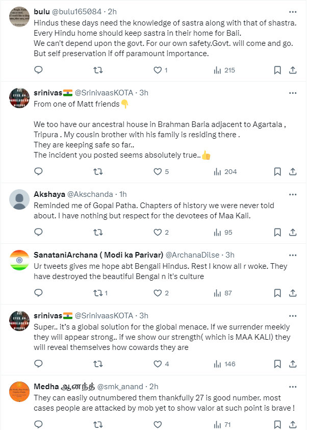 “From a distance, the family understood that the Mu$lims were coming. The total number of family members in the house was 27, and they picked up curved swords (used for balis), big fish cutters, vegetable cutters, axes, grass cutters, etc. As the MusLims arrived everyone charged towards them shouting ~ Joy Ma Joy Ma Joy Ma. Seeing them coming with the weapons, the Muslims fled for their lives. I am proud to be a member of this family. The story will be written in golden letters in my life. Jai Bhabani,” Das posted on Facebook, an English translation of which was posted by author Monidipa Bose – Dey on X (Twitter) along with a screenshot of the original post.