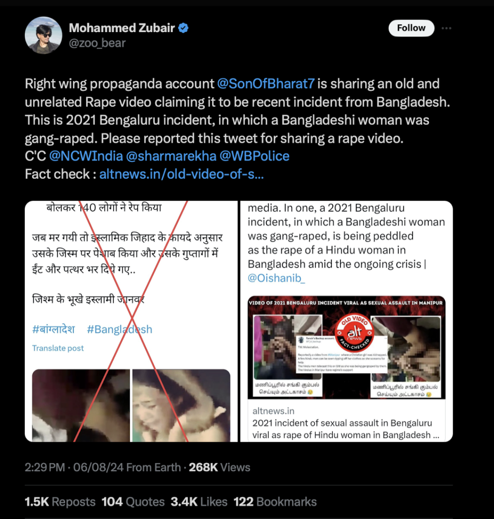 One such attempt to downplay instances of violence and ransacking faced by Hindus in Bangladesh was made by Zubair and Alt News on August 6, 2024, as it published a ‘fact-check’ about a bloodcurdling video of a woman being gang-raped by Bangladeshi men.