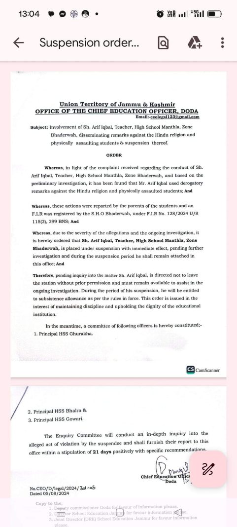 The parents of the victims reported these actions and a First Information Report (FIR) was filed by Station House Officer (SHO) Bhaderwah under F.I.R No. 128/2024 U/S 115(2), under section 299 (Deliberate and malicious acts, intended to outrage religious feelings of any class by insulting its religion or religious beliefs) of Bharatiya Nyaya Sanhita (BNS). It further mentioned, “Whereas, due to the severity of the allegations and the ongoing investigation, it is hereby ordered that Sh. Arif Iqbal, Teacher, High School Manthla, Zone Bhaderwah, is placed under suspension with immediate effect, pending further investigation and during the suspension period he shall remain attached in this office.”