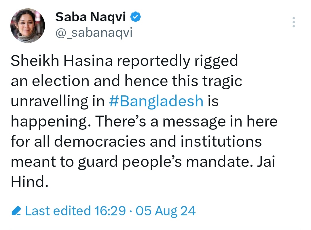 “Sheikh Hasina reportedly rigged an election and hence this tragic unravelling in #Bangladesh is happening. There’s a message in here for all democracies and institutions meant to guard people’s mandate. Jai Hind,” Saba Naqvi, the self-proclaimed flagbearer of democracy and secularism who had once mocked Shivling, tweeted following the turn of events that transpired in Bangladesh earlier today.