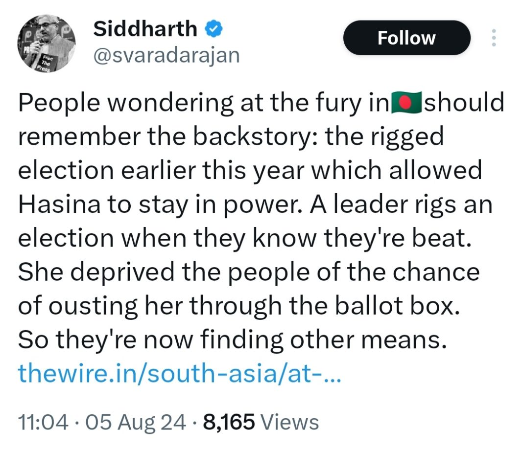 The founder of the far-left leftwing portal The Wire, Siddharth Varadarajan, also appeared to peddle a similar propaganda trope that ‘rigged elections’ in Bangladesh are the cause of the events we are witnessing today.