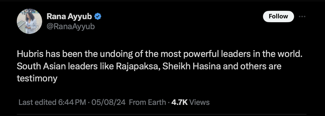 Rana Ayyub claimed “hubris” has been the undoing of Sheikh Hasina, a democratically elected leader in Bangladesh.