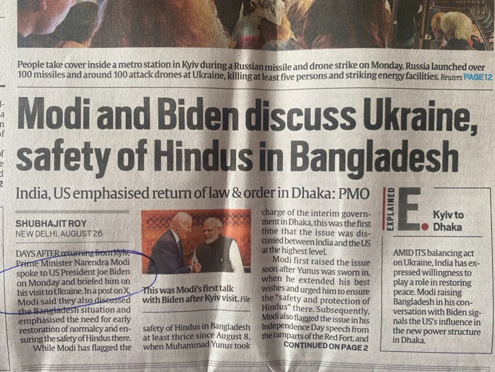 The opening paragraph of the meticulously crafted report by the Indian Express on August 26th stated, “Days after returning from Kyiv, Prime Minister Narendra Modi spoke to US President Joe Biden on Monday,” subtly suggesting that Modi had initiated the call to Joe Biden.