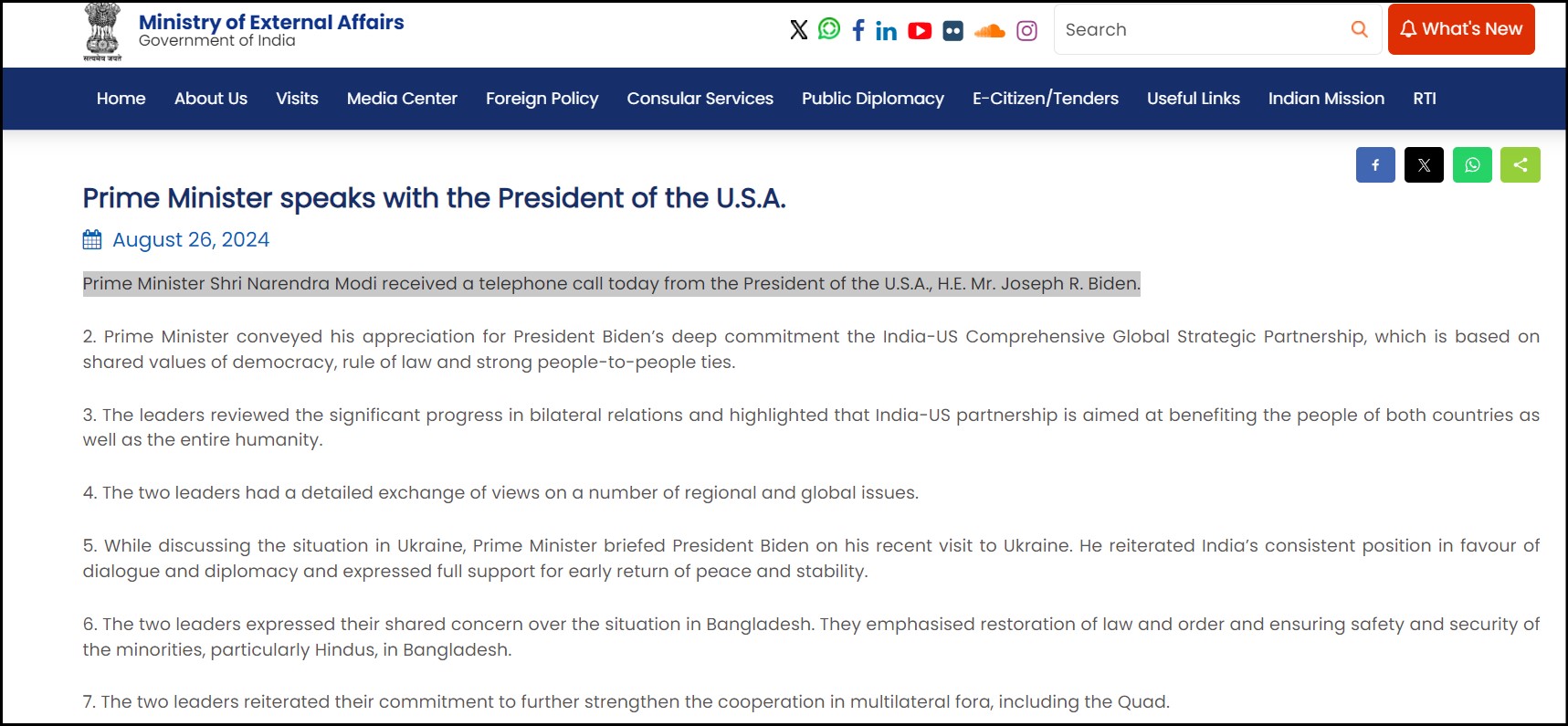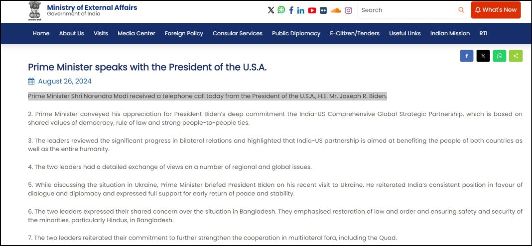 While the Indian Express implied that Modi had initiated the call to the US President, the Ministry of External Affairs, in its press release on August 26th, clearly stated that Prime Minister Shri Narendra Modi received a telephone call from the President of the U.S.A., H.E. Mr Joseph R. Biden.