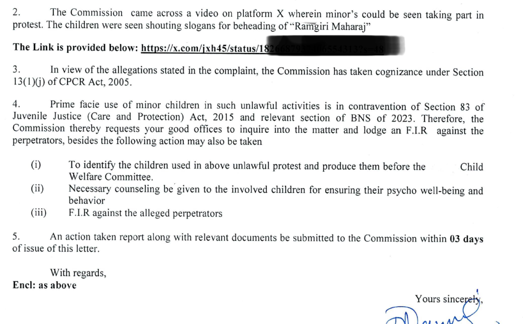 “The Commission came across a video on platform X wherein minors could be seen taking part in the protests against Ramgiri Maharaj. The children were seen shouting slogans for the beheading of Ramgiri Maharaj,” the NCPCR said in an official statement.