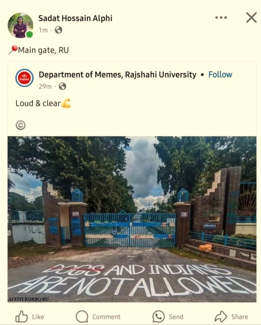 The post read, ‘Loud and Clear’ and was accompanied by a picture of the main gate of the Rajshahi University in Bangladesh.