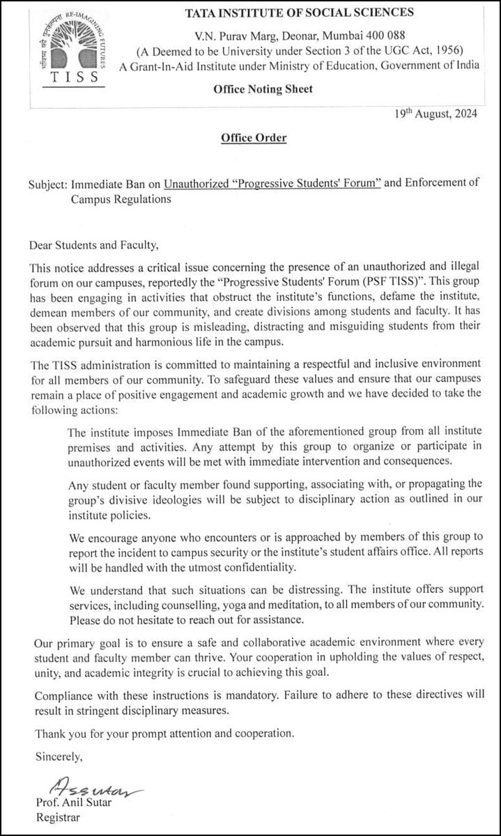 The notice banning the organisation was signed by Registrar Professor Anil Sutar. TISS designated PSF as an “unauthorised and illegal forum” on its campus and accused them of misleading students, obstructing the functioning of the institute, creating division among the students and faculty and defaming the institute. The notice read, “This group has been engaging in activities that obstruct the institute’s functions, defame the institute, demean members of our community, and create divisions among students and faculty. It has been observed that this group is misleading, distracting and misguiding students from their academic pursuit and harmonious life in the campus.”