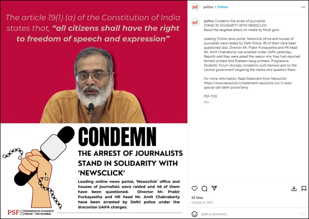 In another post, they expressed solidarity with Newsclick’s Prabir Purkayastha who was booked under UAPA for allegedly taking money from China for anti-India activities. The Delhi Police arrested Newsclick founder and editor Prabir Purkayastha and HR head Amit Chakravarty on 3rd October 2023 under the Unlawful Activities Prevention Act. Delhi Police raided and sealed the NewsClick office on the same day in relation to the case involving foreign funding from China to spread narratives that were critical of India.